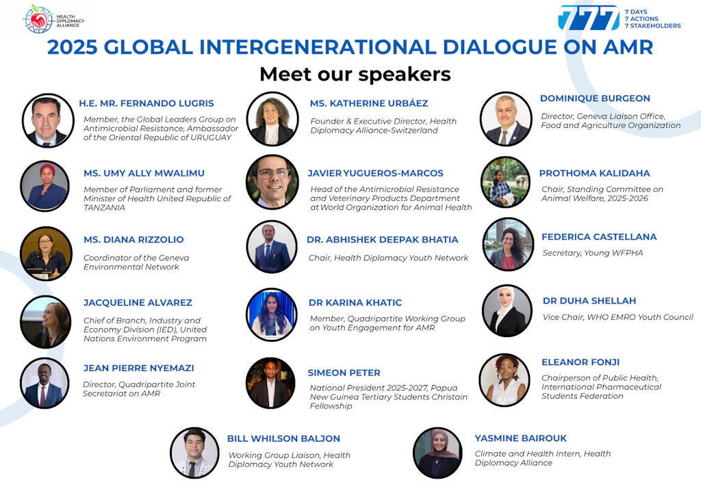 Am Global Intergenerational Dialogue 2025 on AMR (generationenübergreifender Weltdialog zu Antibiotikaresistenzen) kamen Akteurinnen und Akteure des Quadripartite (Allianz aus vier Partnerorganisationen) sowie Vertreterinnen und Vertreter von Jugendorganisationen zusammen, um die Zusammenarbeit zwischen den Generationen und Sektoren zu verstärken. Vor dem Hintergrund der aktuellen globalen Dynamik ermöglichte es die Initiative, die Perspektiven junger Menschen mittels gezielter Umfragen zu erfassen und auszuwerten. Dabei wurde gleichzeitig der Austausch von Erfahrungen und Erfolgsgeschichten zwischen Regionen und Handlungsfeldern gefördert. Der Dialog brachte auch praktische und umsetzbare Empfehlungen hervor, um den inklusiven One Health-Ansatz nachhaltig in den Mittelpunkt der globalen AMR-Governance zu rücken.