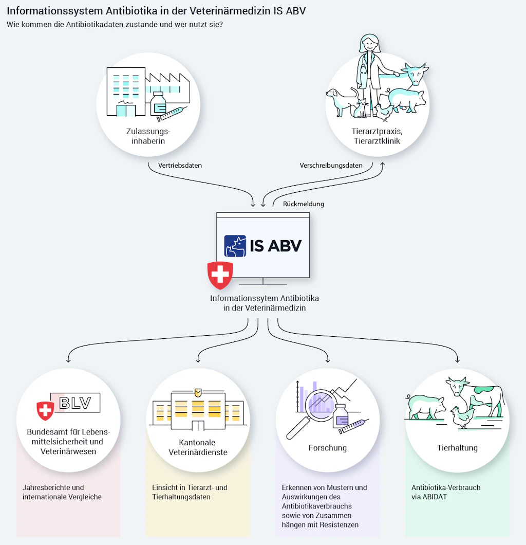 Mit den erhobenen Daten lassen sich Trends bei der Verwendung von Antibiotika in der Schweiz beobachten. Im Veterinärbereich wird die jährliche Vertriebsmenge von Antibiotika von den jeweiligen Zulassungsinhaberinnen gemeldet. Seit 2019 müssen Tierarztpraxen und -kliniken zusätzlich die Daten der von ihnen verschriebenen Antibiotika im IS ABV erfassen. Die gesammelten Informationen ergeben ein klares Bild über das Inverkehrbringen und den Verbrauch von Antibiotika für Nutz- und Heimtiere.