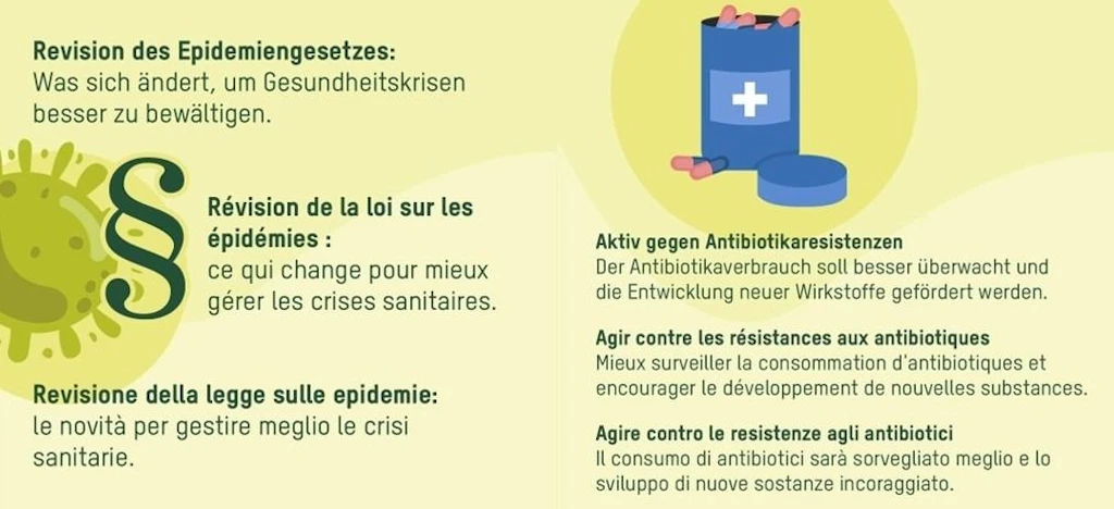 Das Epidemiengesetz (EpG) regelt, wie und durch wen übertragbare Krankheiten erkannt, überwacht, verhütet und bekämpft werden. Es wird überarbeitet, um Erkenntnisse aus der Covid-19-Pandemie zu berücksichtigen und um dafür zu sorgen, dass die Schweiz künftige Gesundheitskrisen möglichst gut bewältigen kann. Dazu gehört etwa auch, Antibiotikaresistenzen besser zu verhüten und zu bekämpfen.