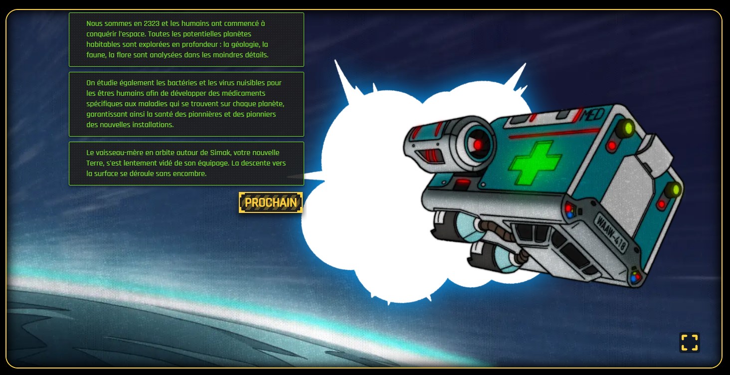 Dieses Serious Game wurde in Zusammenarbeit mit dem Atelier Sémaphore entwickelt und bleibt bis zum Oktober 2024 online geschaltet. Während der WAAW 2023 nahmen zahlreiche Spielerinnen und Spieler die Herausforderung an, sich in die Lage der Gesundheitsfachpersonen auf der Erde zu versetzen und mit den Chancen und Risiken von Antibiotika umgehen zu lernen.