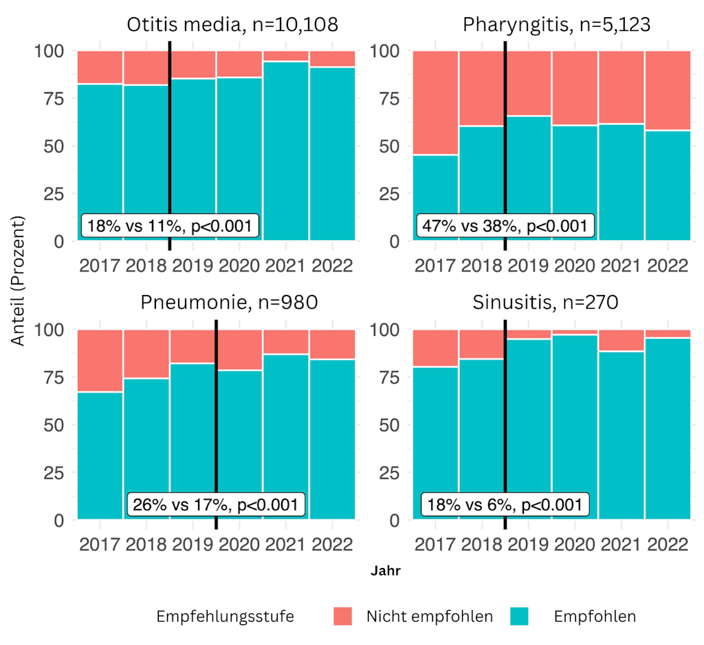 Abbildung 1: Anteil der empfohlenen und nicht empfohlenen Antibiotikaverordnungen nach klinischer Indikation seit Einführung der nationalen Empfehlungen.