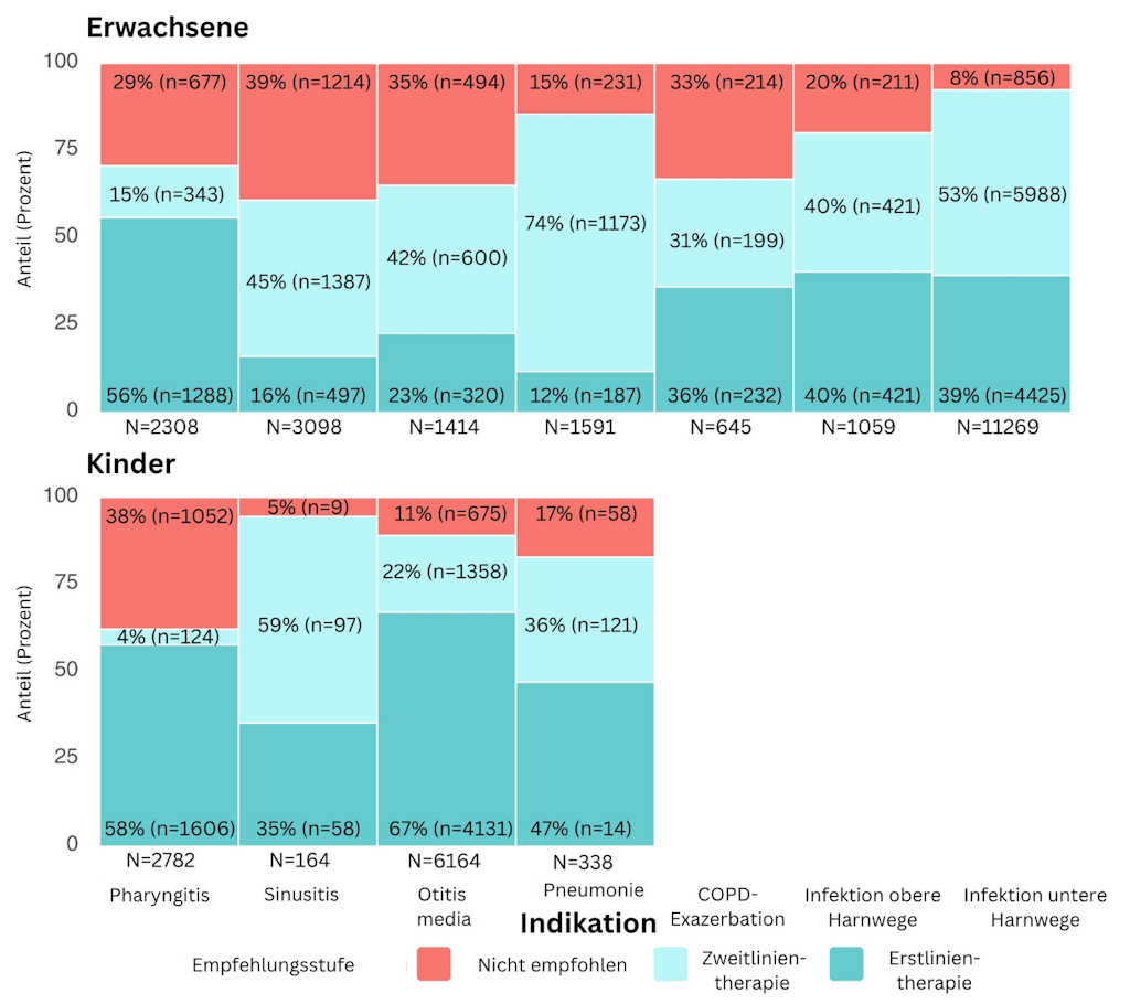 Zudem wurden bei erwachsenen Patientinnen und Patienten bei fast allen klinischen Indikationen häufiger Zweitlinien-Antibiotika verschrieben als die empfohlene Erstlinientherapien. Zwar kann aus den Sentinella-Daten nicht abgeleitet werden, dass diese Verschreibungen unsachgemäss sind, jedoch deutet der sehr hohe Anteil darauf hin, dass Zweitlinien-Antibiotika auch für Fälle verschrieben werden, in denen dies nicht von den nationalen Richtlinien empfohlen wird.