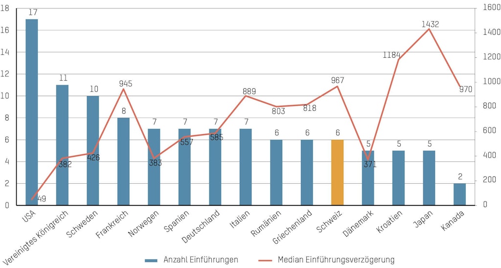 Die rote Linie in der Abbildung zeigt die Anzahl Tage (Median), die zwischen der Erstzulassung der Substanzen im Ausland – zumeist in den USA – und dem Markteintritt im jeweiligen Land vergingen. In der Schweiz vergingen zwischen der Erstzulassung im Ausland und dem Markteintritt 967 Tage (Median) respektive zwei Jahre und acht Monate. Damit befindet sich die Schweiz auf einem ähnlichen Niveau wie die Nachbarländer Frankreich und Italien.