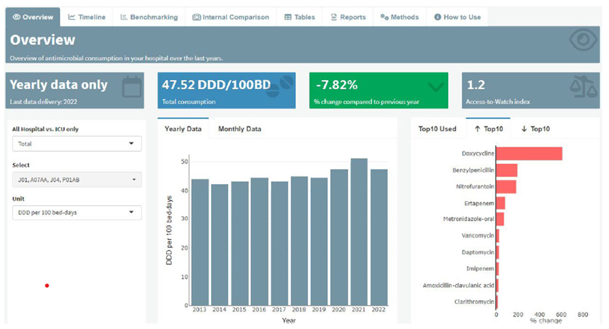 To support the monitoring and optimisation of antibiotic consumption in hospitals as part of antibiotic stewardship programmes, ANRESIS provides the most important data in interactive dashboards. A dashboard is a graphical user interface for visualising data. This user-friendly tool provides an overview of the most important indicators of antibiotic consumption in a hospital or ward. It provides insights into various aspects, such as the proportion of broad-spectrum antibiotics, consumption per administration route and consumption according to the AWARE criteria (Access, Watch, Reserve). Comparisons with other Swiss hospitals are also possible. The dashboard is interactive: data can be viewed monthly or annually as required at the level of antibiotic groups or individual substances. The dashboard thus helps healthcare professionals analyse trends and define measures to optimise antibiotic use in everyday practice (see Figure 2). So far, data from about 70 hospitals have been included; other interested hospitals can contact anresis.ifik@unibe.ch to get access to the dashboard.