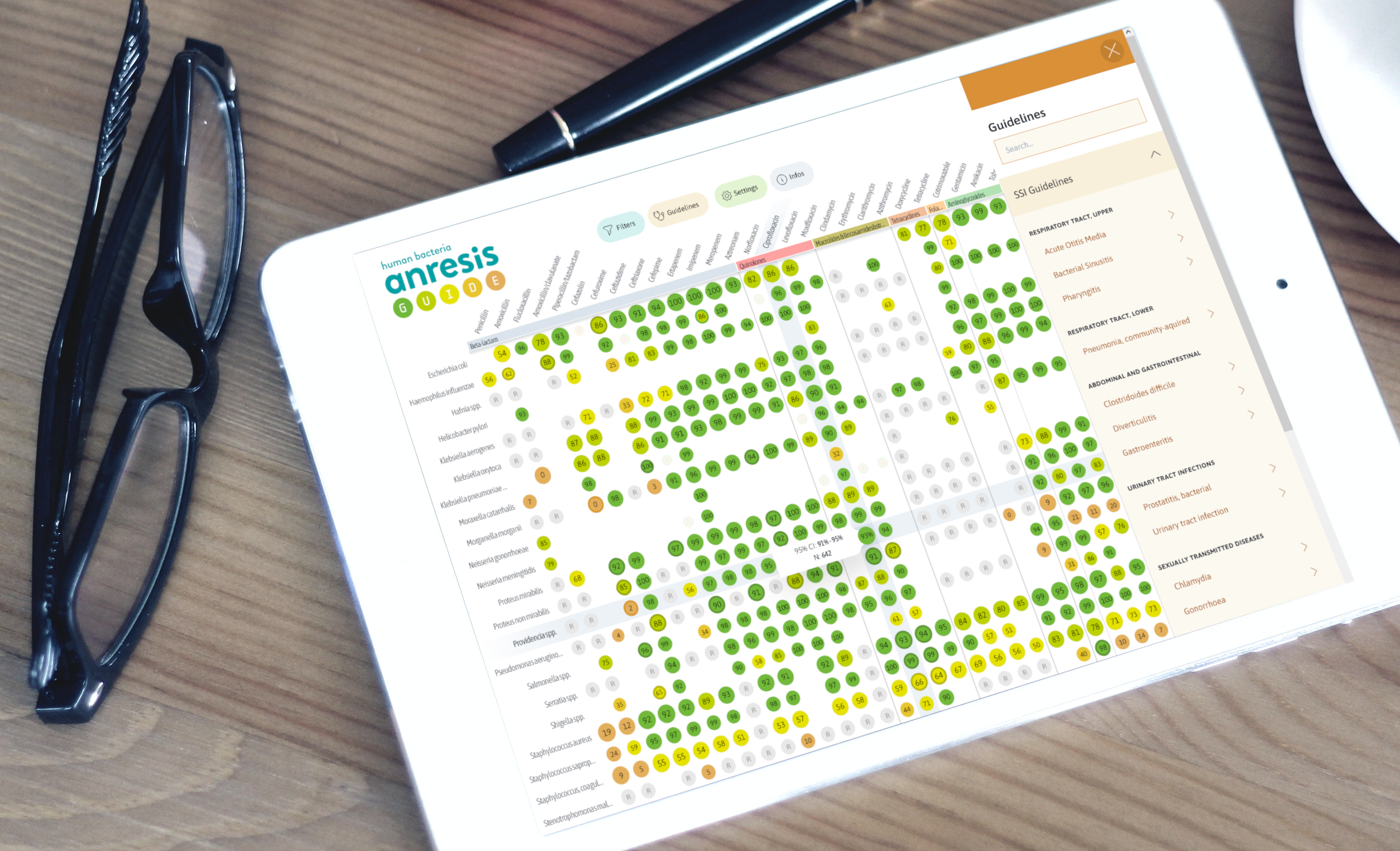The newly developed ANRESIS Guide application (guide.anresis.ch, see Figure 1) replaces the previous INFECT app. The ANRESIS Guide helps clinicians choose the optimal antibiotic therapy. The current resistance data for Switzerland and also local resistance data can be displayed for each pathogen/antibiotic combination implemented in the system. In addition to the current resistance rates for bacteria in humans, the application also contains important additional information such as veterinary data, resistance in pathogenic fungi, information on natural resistance and an extended germ spectrum with multi-resistant microorganisms. Additional filter options make it easier to find data. For example, information on regional resistance rates can be retrieved. A key feature is the integration of the national antibiotic guidelines published by the Swiss Society for Infectious Diseases. It is now also possible for users to create their own preselection and save it locally. The display has also been optimised for small screens.