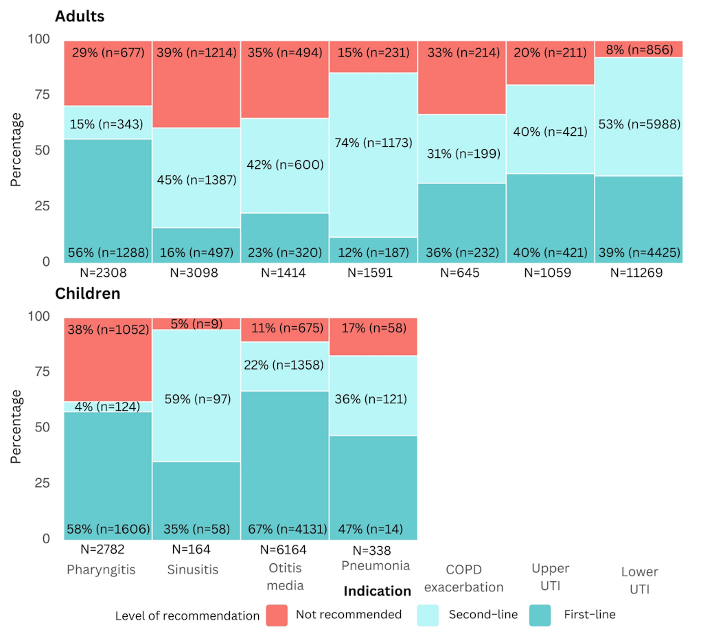 The results show that almost one in five prescriptions are not in line with the guidelines – 18% for adults and 19% for children. This means that the antibiotic prescribed is neither the recommended first-line treatment nor one of the recommended alternatives. Certain indications show particularly high non-adherence rates, especially sinusitis in adults (39%) and pharyngitis in children (38%) (see Figure 1). The most common non-recommended antibiotic classes prescribed in adults were beta-lactamase inhibitors in combination with penicillins for pharyngitis (24%) and macrolides for sinusitis (18%).