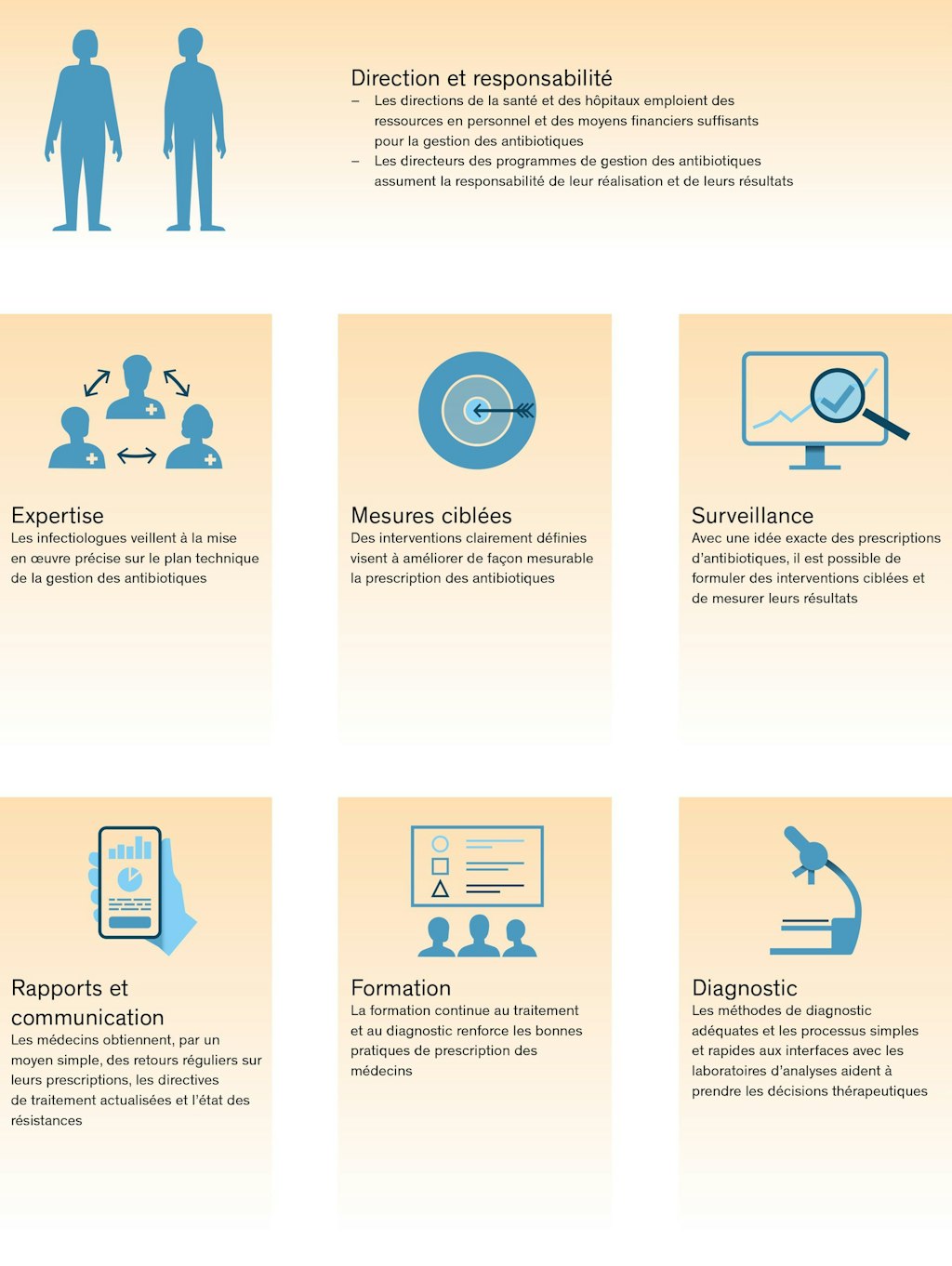 Si les ressources humaines et financières nécessaires sont allouées à ces activités, lesquelles sont ensuite institutionnalisées, on parle alors d’un programme de gestion des antibiotiques (Antimicrobial Stewardship Programm, ASP). Un tel programme prend la forme d’un ensemble coordonné des activités susmentionnées et favorise une gestion responsable des antibiotiques (cf. illustration). Différentes études montrent que les ASP constituent un moyen efficace de réduire l’apparition des résistances, tout en ayant des effets positifs sur les patients (réduction des effets secondaires et de la durée des séjours à l’hôpital) et en diminuant les coûts des traitements hospitaliers.
