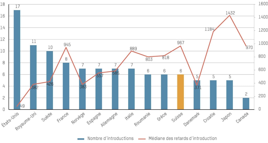 La courbe rouge de l’illustration 1 indique le nombre de jours qui se sont écoulés (valeur médiane), entre la première autorisation des substances à l’étranger (principalement aux États-Unis) et la mise sur le marché dans chaque pays. En Suisse, ce nombre s’est élevé (valeur médiane) à 967 jours, soit deux ans et huit mois. La Suisse se trouve ainsi au même niveau que la France et l’Italie.