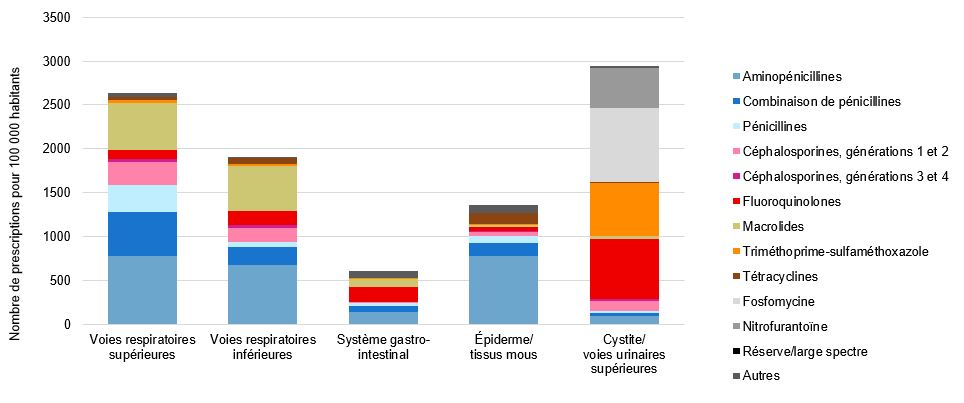 Toutes classes d’âge confondues, l’utilisation élevée de fluoroquinolones pose problème (voir graphique 2). Ces antibiotiques sont encore prescrits dans plus de 20 pour cent des cas d’infection urinaire, bien que cela soit en contradiction avec les preuves cliniques. Des antibiotiques sont aussi toujours prescrits pour traiter les bronchites aiguës, qui représentent la forme la plus fréquente d’infection des voies respiratoires inférieures, bien que cela aille à l’encontre des directives concernées.
