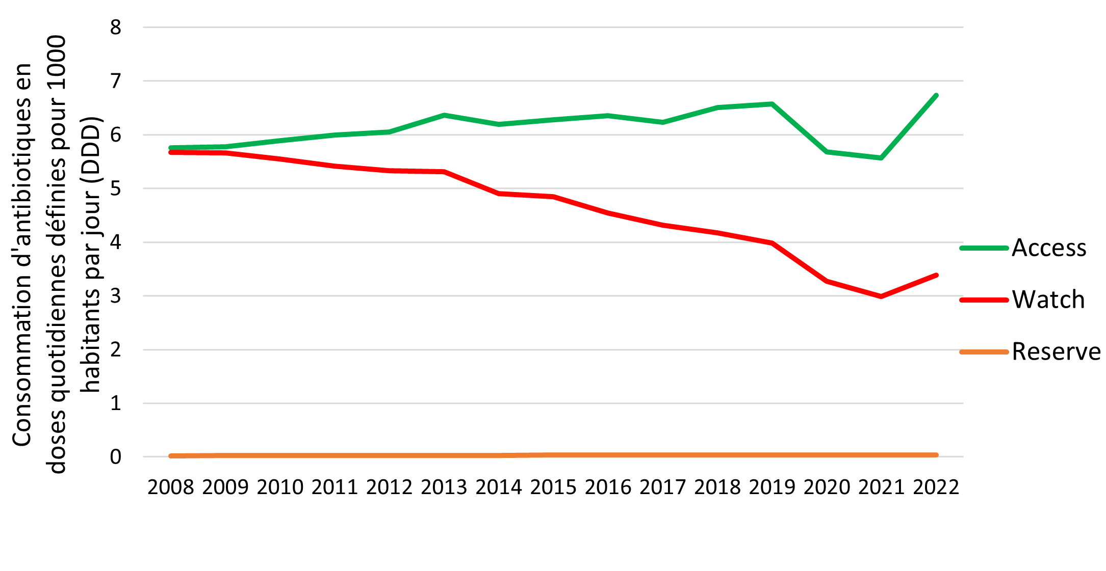 - « Reserve » : ces antibiotiques ne devraient être utilisés que si aucun autre n’est efficace. Le groupe « Reserve » joue un rôle négligeable dans le cadre ambulatoire.