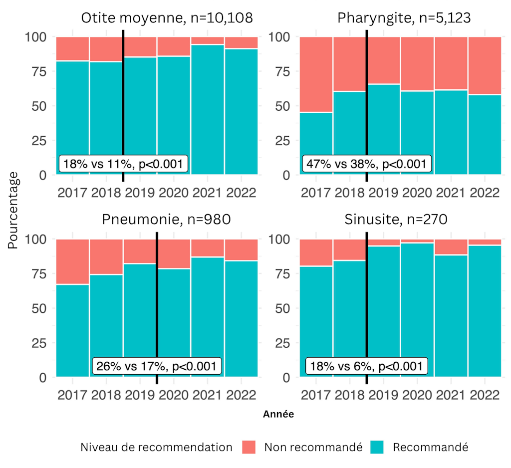 Figure 1 : Proportion de prescriptions d’antibiotiques recommandées et non recommandées, par indication clinique, depuis l’introduction des recommandations nationales.