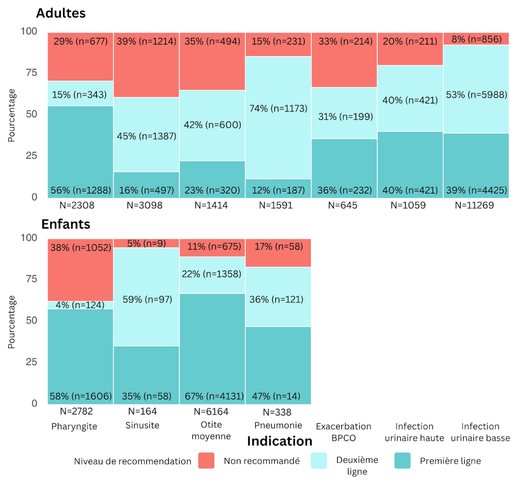 Les résultats montrent que près d’une prescription sur cinq n’est pas alignée sur les recommandations – 18 % chez les adultes, 19 % chez les enfants –, c’est-à-dire que l’antibiotique prescrit ne correspond ni à la substance recommandée en première ligne, ni aux alternatives recommandées. Certaines indications présentent des taux de non-alignement particulièrement élevés, notamment la sinusite chez l’adulte (39 %) et la pharyngite chez l’enfant (38 % ; voir figure 1). Les classes d’antibiotiques non recommandées les plus fréquemment prescrites chez les adultes étaient les pénicillines associées à un inhibiteur de bêta-lactamase dans le cas de la pharyngite (24 %), et les macrolides dans le cas de la sinusite (18 %).