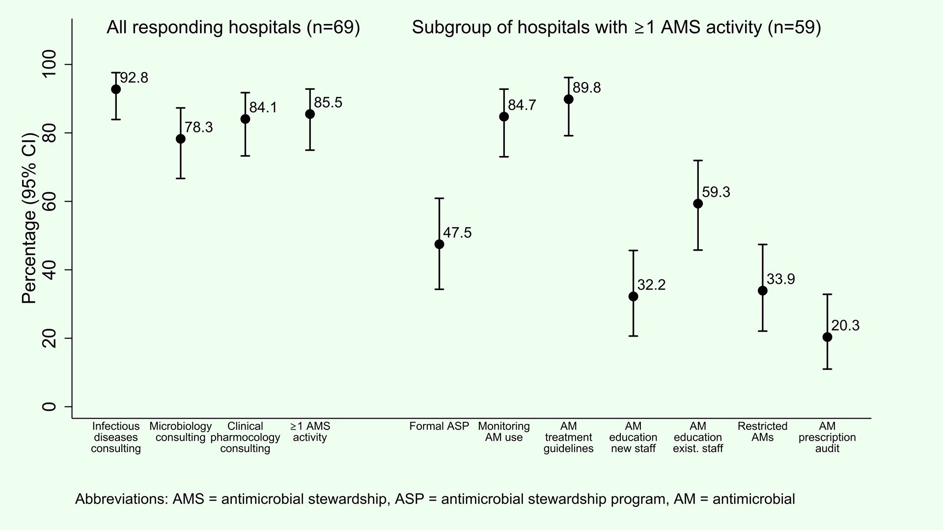 Dei 136 ospedali invitati, 69 hanno partecipato all'indagine, corrispondente a un tasso di risposta del 51%. L’indagine del 2024 mostra che la maggior parte degli ospedali dispone di strutture per le attività di antimicrobial stewardship come servizi di consulenza in malattie infettive, farmacologia clinica e microbiologia. Gli ospedali attivi nel antimicrobial stewardship generalmente monitorano il consumo di antimicrobici e molti di essi redigono un rapporto annuale destinato ai medici prescrittori. Di solito, questi ospedali dispongono di linee guida fondate sull’evidenza scientifica per il trattamento antibiotico o l’uso perioperatorio di antibiotici.