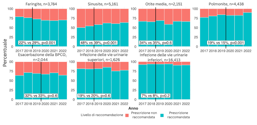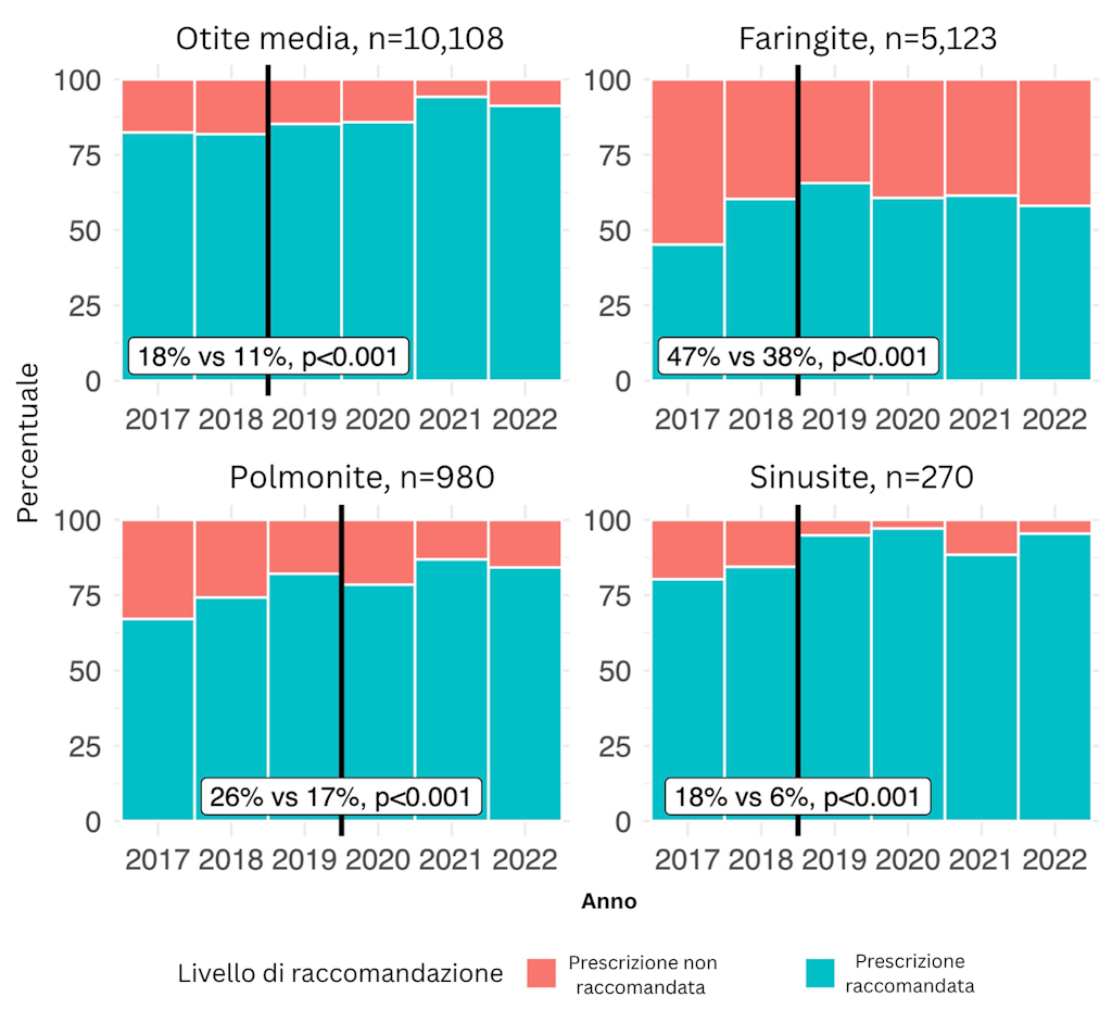 Figura 1: Percentuale delle prescrizioni di antibiotici raccomandate e non raccomandate per indicazione clinica dall’introduzione delle raccomandazioni nazionali.